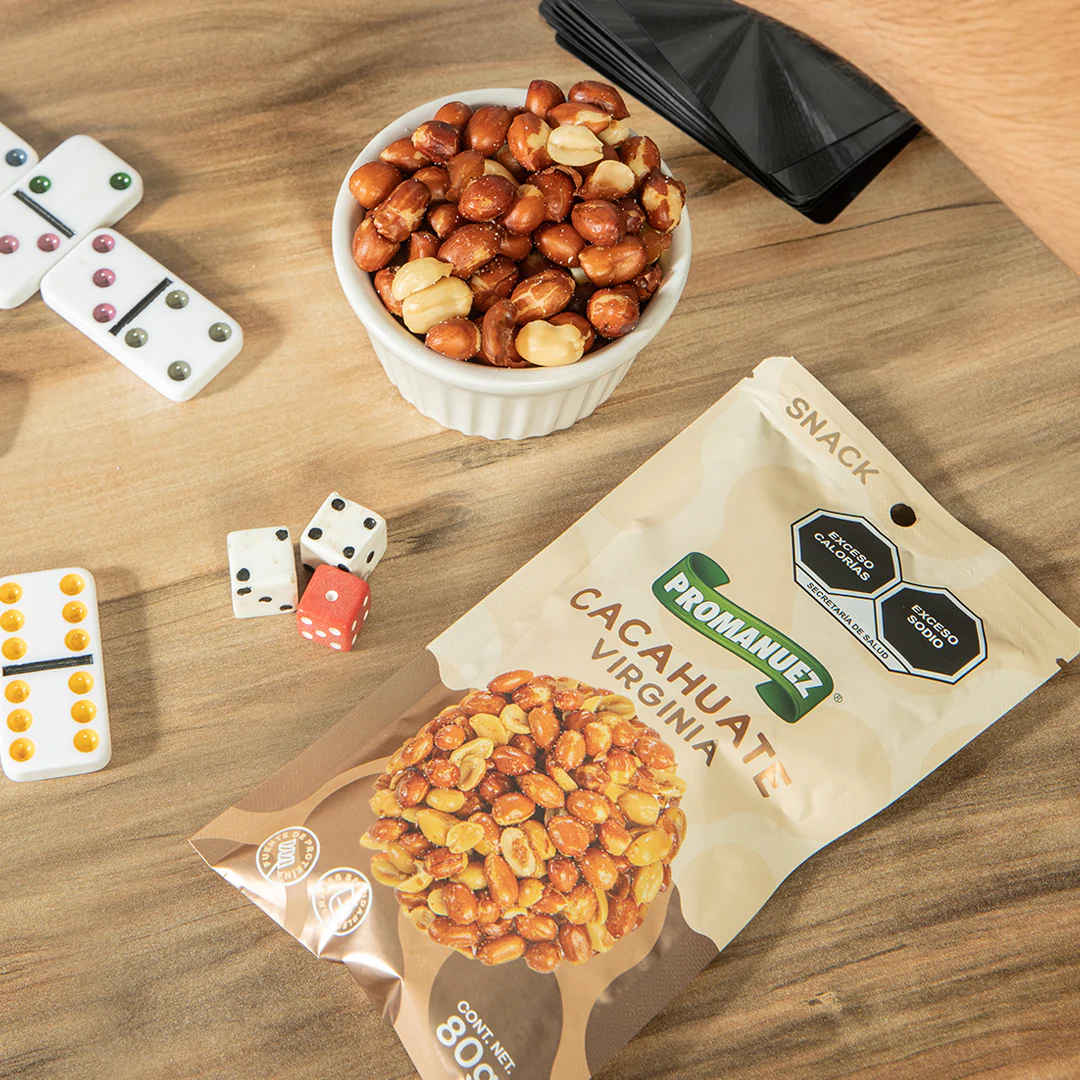 Disfruta del sabor natural de nuestros cacahuates Virginia tostados, un clásico snack lleno de sabor ideal para cualquier momento de tu día.