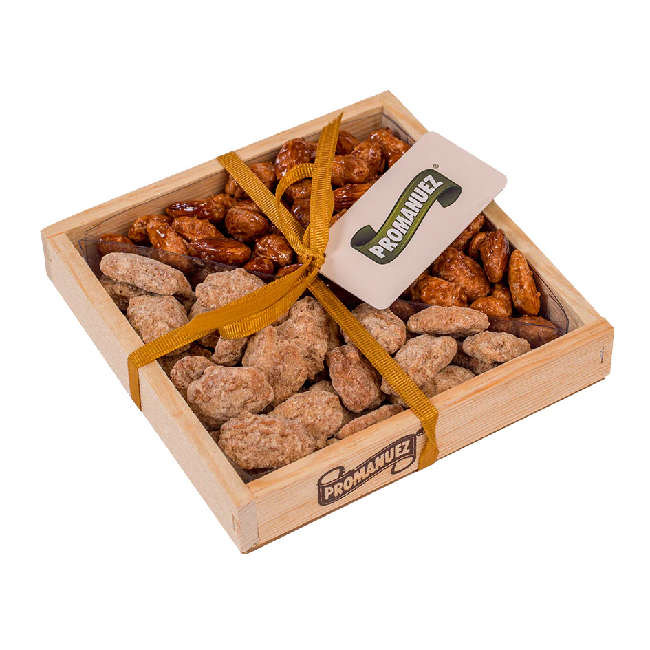 Disfruta un detalle navideño lleno de sabor y elegancia. Presentado en una fina charola de madera, este regalo incluye dos deliciosas mezclas: nuez glaseada (90 g) y almendra garapiñada (100 g), separadas en micas de acetato con tapa desmontable que conservan su frescura y calidad.